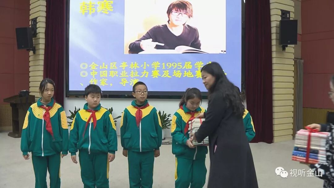 3月19日上午,在亭林小学的晨会上,校长张蓓蕾代表因为工作不能亲自前来的韩寒把3000多册种类丰富的图书送给孩子们、丰富他们的图书馆,鼓励孩子们多看书、爱看书。