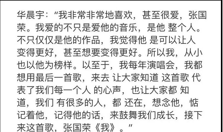 2018年9月9日华晨宇在北京鸟巢开演唱会,一如之前,最后一首压轴歌依然是张国荣先生的《我》,在演唱会现场,华晨宇真情告白: