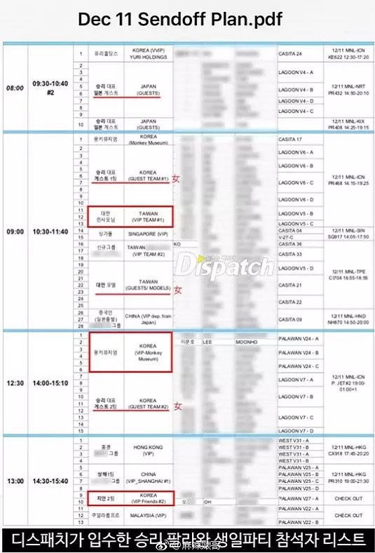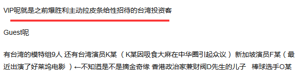 D社报道,李胜利把受邀人分为VIP和来宾,曝光的一些VIP名单里,有香港有权有势的人和富翁D某的儿子T,还有曾因吸食大麻引发中华圈质疑的台湾演员K,及近期出演了好莱坞电影的新加坡演员F。