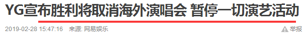 YG方宣布,取消李胜利海外演唱会,暂停一切演艺活动。