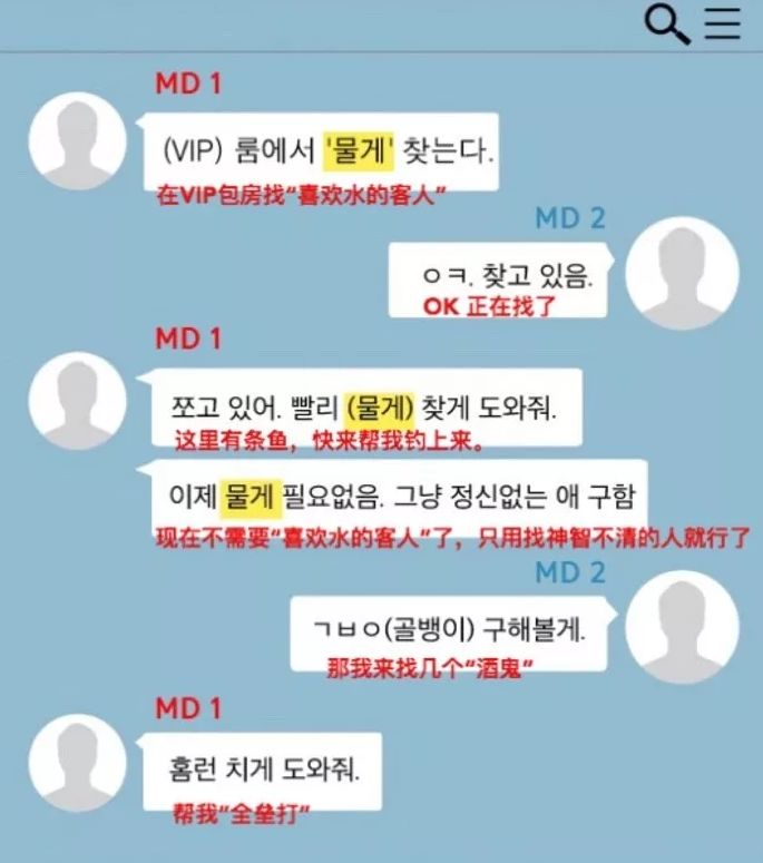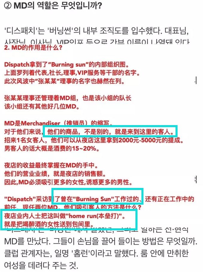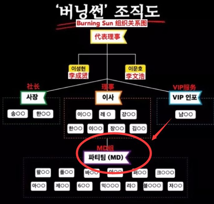 在Burning Sun的组织关系图里,有一个MD的推销员职位,主要干什么呢?招揽女性顾客,把喝醉酒的女性送到包间去。