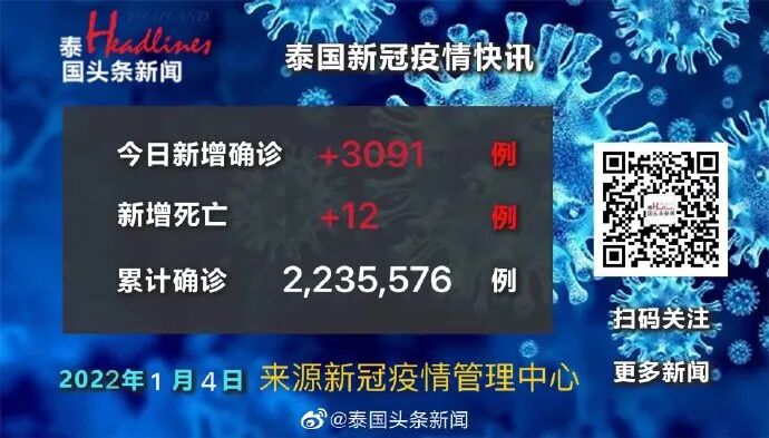 泰国头条新闻社讯 1月4日泰国新冠疫情中心消息显示:今日泰国新增3,091例确诊病例;新增治愈2,688例;新增死亡12例。