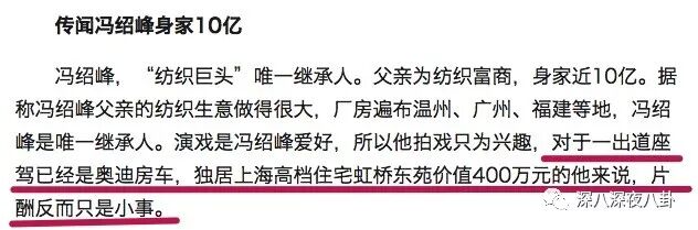 顶着富二代身份出道的冯绍峰据说家产十位数,入门座驾就是奥迪