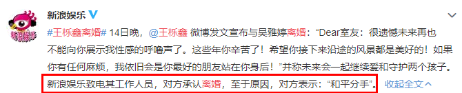王栎鑫真正的离婚原因不就在这! 八爪娱记 内地男星 2020-12-15 16:29:32 1176 创作不易,用心坚持,欢迎请BaGua喝几杯爱心咖啡!打赏并支持本文 打赏并删除本文 小可爱们,为了让你们不错过我的每一篇文章,请设“置顶”哦~点击左上方“八爪娱记”→点击右上角“...” → 点选“设为星标 ★ ”就可以第一时间收到我的推送啦!啧啧,最近是真的没什么重磅大瓜,以至于这样一个“十八线艺人离婚”的事,居然也能爆热搜了。昨天晚上王栎鑫和妻子吴雅婷分别发文宣布了离婚的消息。王栎鑫在18岁的时候参加了2007年的快男,后来获得第七名。出道以后演了不少电视剧,但是没多大水花,最出名的应该是刘昊然和谭松韵主演的《最好的我们》里面那个看着很坏其实又很深情的路星河。对于这个消息,网友们自然是十分震惊的。毕竟从俩人的过往互动来看,真的是一对低调又甜蜜的小夫妻。王栎鑫的前妻吴雅婷,最开始有网友说她曾是王栎鑫的粉丝,随后拿下了男神,但这个说法后来被否认了,流传的最广的就是她来自湖南,是一个电视台的编导。两人在朋友的聚会上认识,彼此看对了眼,恋爱了两三年后决定携手往后余生。2015年2月2日,王栎鑫和吴雅婷结婚。当时,很多07届的很多快男也悉数到场,苏醒、吉杰、张远、王铮亮、陆虎、姚政、余儒海等都出现在了他的婚礼上。婚后生了一儿一女,之前一直很恩爱。微博的日常也是晒娃秀恩爱。上节目的时候,小两口也挺甜的,吴雅婷喜欢李现,王栎鑫说自己可以邀请李现到家里。后面又说老婆最近还爱上了易烊千玺。吴雅婷看《想见你》的时候喜欢上李子维(谁不喜欢李子维呢!!重点错!),他就装深沉装扮成王子维,表示自己可以天天在家扮演吴雅婷的各个墙头。总之,王栎鑫以往所表现出来的都是好老公、好男人的形象,跟老婆的婚姻也一直没什么传闻,所以当他忽然宣布离婚,这才会让大家感到震惊。有吃瓜群众联想到明年1月开始实施离婚冷静期的新闻,纷纷留言问他是不是害怕明年离婚冷静期。也有说法是吴雅婷家暴王栎鑫,女方曾直接在酒店大堂打了王栎鑫一顿。与此同时,这位网友还透露了两人离婚后孩子归属问题,男孩由王栎鑫抚养,女孩则是吴雅婷带着。也有网友继续爆料,说他们是六月份离婚的,当时王栎鑫的脸被老婆抓得全是指甲印。如果真的是被女的打了,那估计是出轨吧,不然怎么可能之前还这么恩爱,突然下这么重的手?不过有媒体采访了王栎鑫方面的工作人员,对方回应称两人是和平分手,吴雅婷之后也出来回应↓还有网友发现,王栎鑫早在去年的某次采访中就提到,他经常和老婆说,有一天自己会离开,背上行囊过一个人的人生。被记者问到说一件自己一直想做但目前却做不了的事情,他的回答是离婚。你看,细细扒起来,似乎没有什么事是突然的。结婚的理由可能只因为一腔孤勇的爱情,但让人离婚的理由可太多了。说到底很多人还是不信婚姻的脆弱、人性的脆弱,所以一定要为离婚找个原因。大众永远不相信,明星离婚可以只因为一个最简单的原因——爱是会消失的,只有金钱和资本才会永流传。上一条内容:这波男团油腻得差点把我送走.. 创作不易,用心坚持,欢迎请BaGua喝几杯爱心咖啡!打赏并支持本文 打赏并删除本文 感谢您的支持鼓励,我会继续努力的!文章地址:用户邮箱:打赏金额:USDT 请输入数字点击”去打赏“,即可进行打赏支持本文章哦 王栎鑫 About the Author 八爪娱记 功能介绍:一个不八卦会狗带的年轻宁! 王凯、胡歌、王思聪、范冰冰和大黑牛、网瘾少女大幂幂,每天不同的热门八卦给你好看! Related Posts 王栎鑫真正的离婚原因不就在这! 2020-12-15 16:29:32 侯佩岑到底有什么魅力?周杰伦忘不了她,昆凌偷偷关注她! 2020-09-28 16:38:39 十八线糊咖扯出四段恋情,里面还有吴亦凡绯闻女友! 2020-06-23 16:31:02 这种厚颜无耻的人怎么不去死?? 2019-12-16 16:25:30 陈志朋到底是不是妖男变态?? 2019-04-03 16:35:55 发表评论