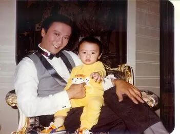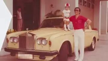 图为谢霆锋站在劳斯莱斯上与父亲合影