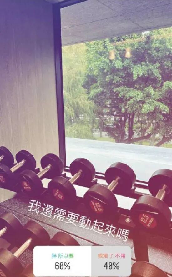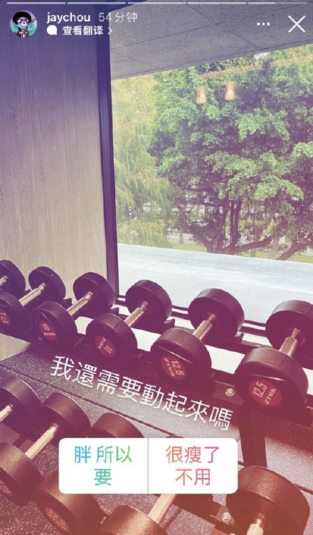 因为就在今年3月31日,周杰伦晒出一张哑铃的图片,并附了一个投票问网友“我还需要动起来吗”: