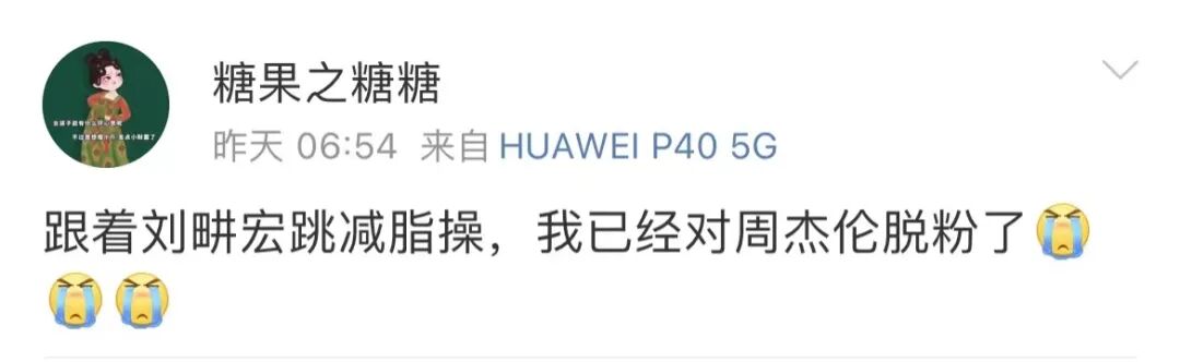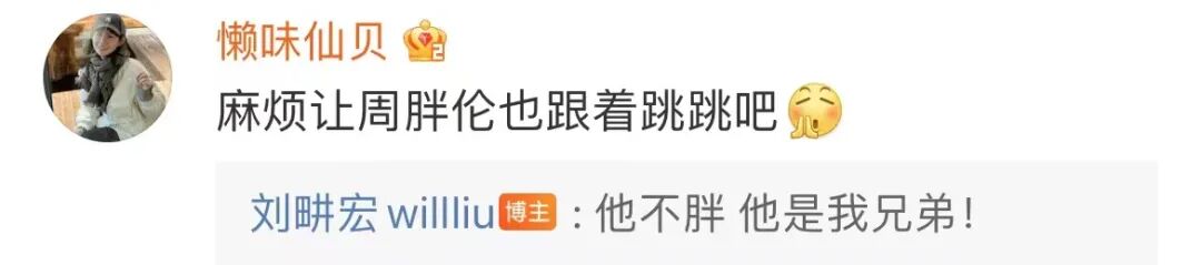 大家都练得这么辛苦了,因此还有网友喊话刘畊宏,叫他拉周胖伦也跟着跳跳吧,毕竟他是唯一能“救”周杰伦的人了: