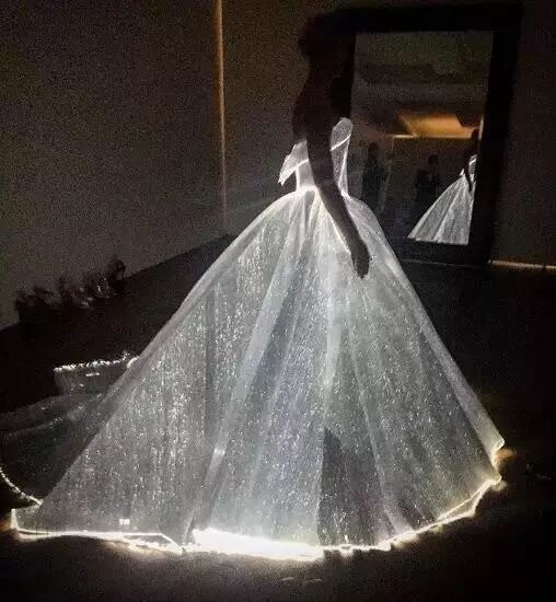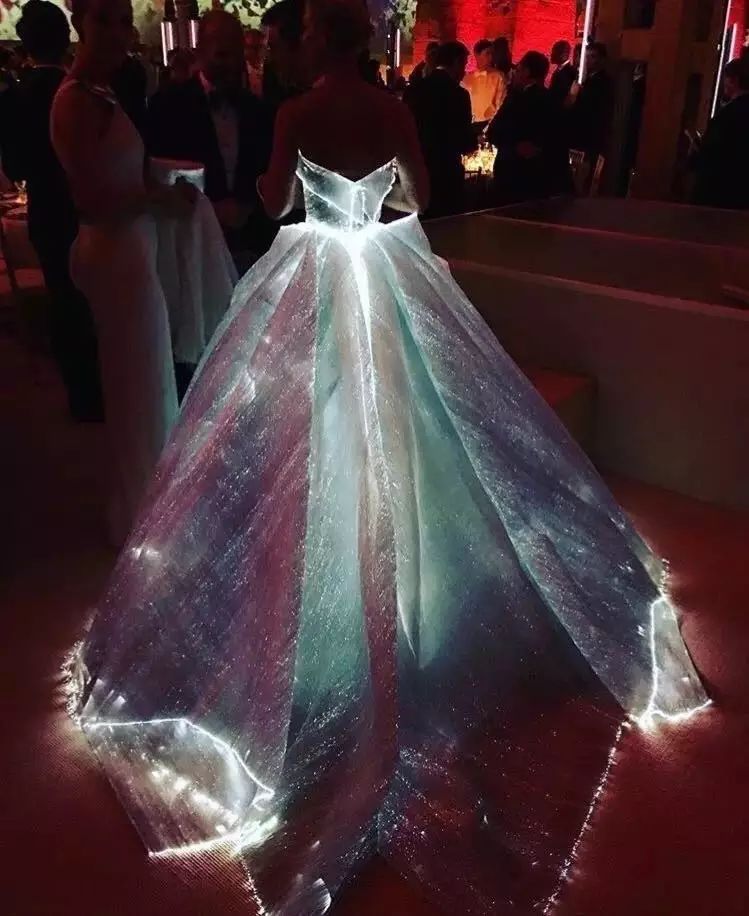 别看这件衣服走红毯时挺素雅的,其实这是件来自Zac Posen的高科技荧光变色礼服。