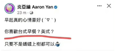 他第一时间发布动态,配文是:“你喜欢台式早餐还是美式?只要不是蚂蚁上树都可以”。