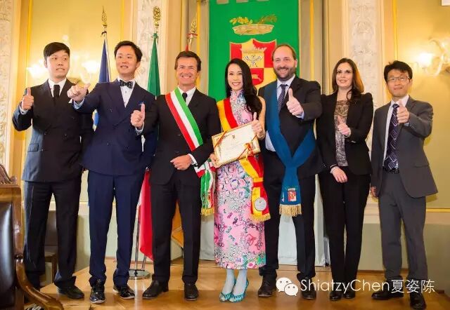 意大利时间5月2日,“华人天后”莫文蔚身穿SHIATZY CHEN夏姿·陈 2016春夏花果嬉游系列粉色真丝旗袍裙,出席意大利贝加莫省(Bergamo) 市政府的受封仪式,授证为「文化大使」。