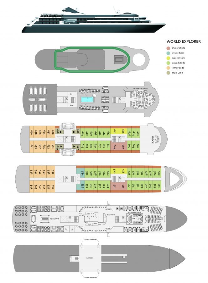 World Explorer拥有六层甲班,每间房间都设有私人走廊和阳台,可欣赏海景。世界探险家还提供了大量的公共场所,可以在一天的室外活动后放松身心。例如玻璃圆顶的观景走廊,享有安静的休息室和图书馆并提供多种饮料,设有室外跑道,小型健身房,桑拿浴室,沐浴更衣室和储物柜。对于喜欢冒险的游客来说,附加设备包括皮划艇,野营和站立桨板。世界探险家将高设计和全功能融合在一起,将成为您海洋上的家。