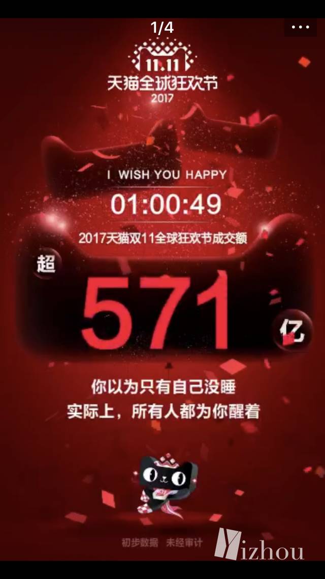 一个小时多,达到了571亿,这个数字已经超过了2014年天猫双11全天的交易额,去年,也就是2016年的双11,达到这个数字花了7个小时。今年的准确具体数据,要等今晚才能知道了。