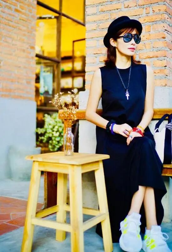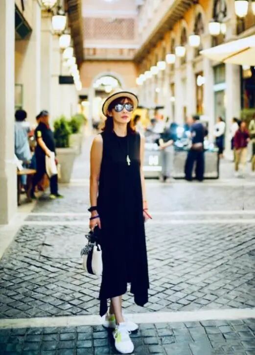 张敏造型解析:黑色无袖连衣裙+小白鞋▼