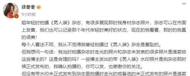 另外,徐冬冬表示,一些授权过的照片发出来无所谓,可是对于一些未授权的走光照,则不应该被发布。