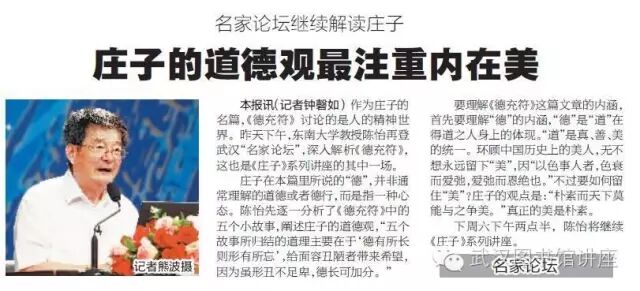 作为庄子的名篇,《德充符》讨论的是人的精神世界。7月23日下午,东南大学教授陈怡再登武汉“名家论坛”,深入解析《德充符》,这也是《庄子》系列讲座的其中一场。