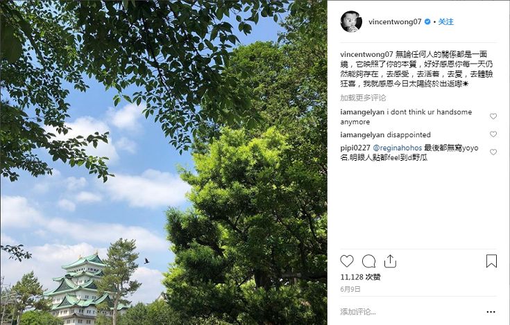 那边厢,就在老婆出席活动前三小时,王浩信在ins贴出一张阳光普照风景相,留言:“无论任何人的关是都是一面镜,它映照了你的本质,好好感恩你每一天仍然能够存在,去感受,去活着,去爱,去验体狂喜,我就感恩今日太阳终于出来了。”