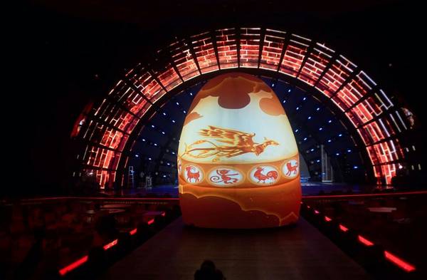 蛋壳装置在开场环节变作屏幕,突然从中间破裂,梦幻的3D全息立体形象破壳而出,灵动而可爱,与此同时,蛋壳外面LED屏幕与之配合,一道光束从天而降,完美融合,令人大开眼界。