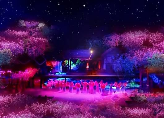 桂林场地中威亚节目的灯光设计也是全球首次应用,通过威亚运动在空中制造形式多变的艺术图案,在水面形成精美绝伦的倒影,把桂林山水之美通过灯光的渲染为观众呈现。