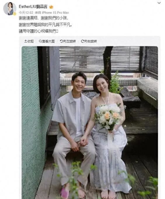 今年6月。她突然发文:“谢谢连晨翔,谢谢我们的小孩,谢谢世界赠与我的平凡与不平凡。”就这么简单的几句话,宣布了婚讯和怀孕。
