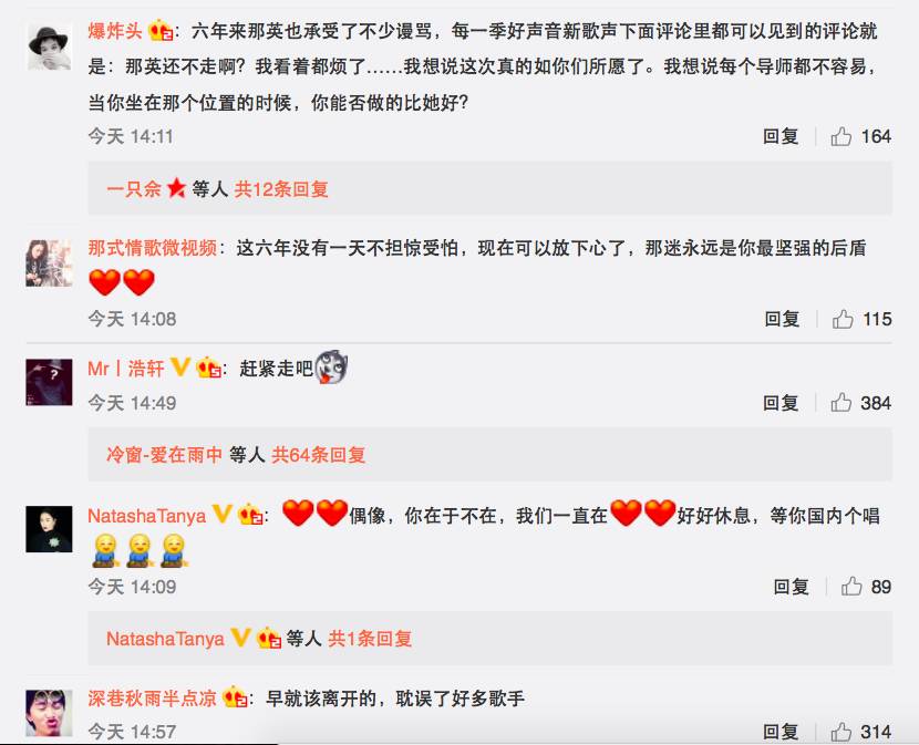 第一季“好声音”开播后,那英说八百年不见的人都从地下钻出来跟她联系,夸她的表现怎么怎么好。与此同时,“骂”她的人也排起了长队。就连她离开声明的微博下,还有人在评论里阴阳怪气:“赶紧走吧。”