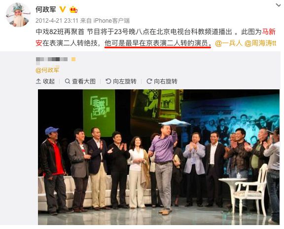 马新安现在是吉林电视台制片人,曾经是最早在北京表演二人转的演员。