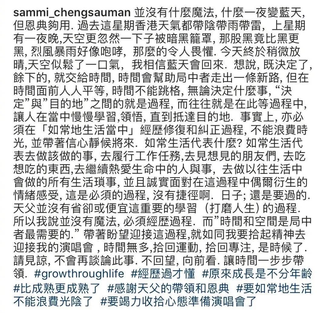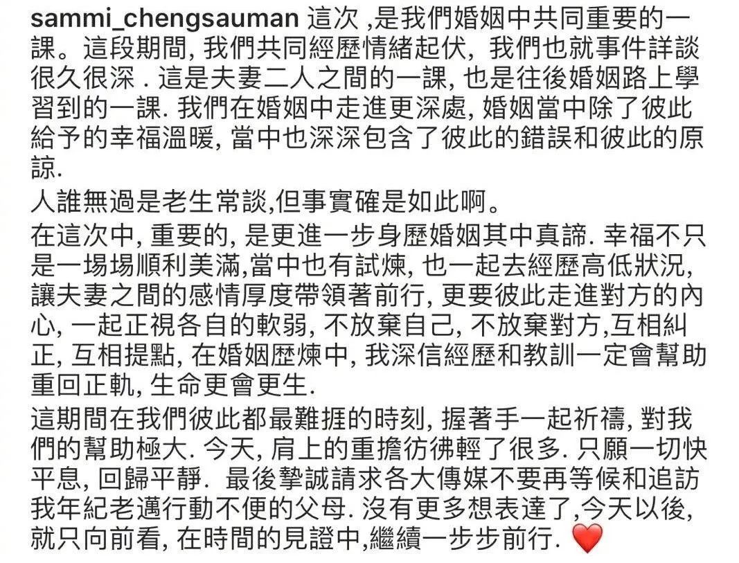 郑秀文随后也在社交平台上发表了长文,大概意思是婚姻中除了温暖还有错误和原谅,人谁无错,我们夫妻一定会互相帮助重回正轨。