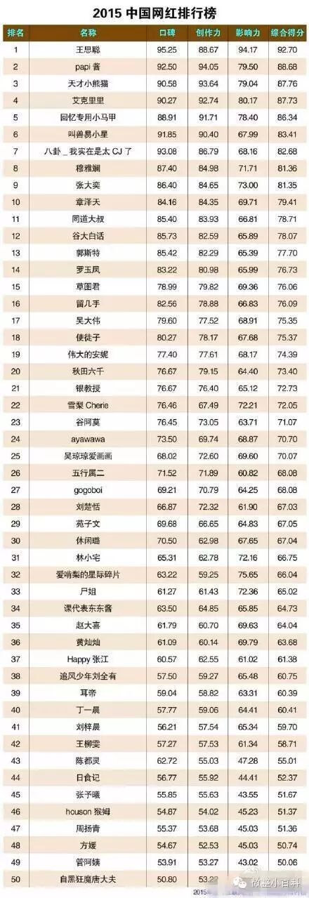 这份榜单中集结了广告圈、段子手、影评人等各路达人,同时更是不乏活跃在娱乐话题风口浪尖上的红人们:王思聪现任女友雪梨Cherie位居22名,前女友张予曦排名45。奶茶妹妹章泽天位居第10名,“凤姐”罗玉凤[微博]第14名,“小芈月”刘楚恬第28名,“武大校花”黄灿灿第36名,“南航校花”陈都灵第43名,罗志祥女友周扬清第47名,郭富城女友方媛第48名。