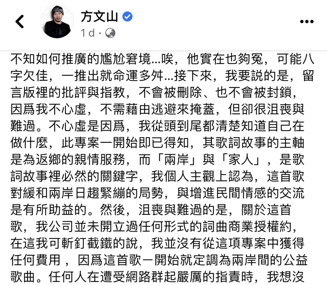 方文山在脸书发文称,他“从头到尾都清楚知道自己在做什么”,认为这首歌“对缓和两岸日趋紧绷的局势与增进民间情感的交流”有益,并强调这首歌是公益歌曲,自己没有从中获得任何费用。