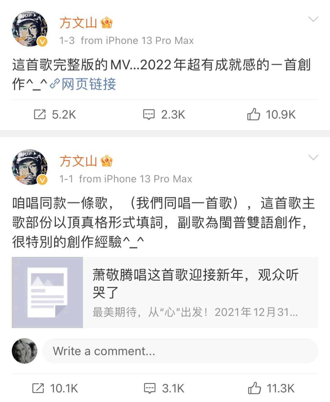 方文山也于1月1日和3日连着发布《我们同唱一首歌》的宣传微博,自豪地称这是他“2022年超有成就感的一首创作”。