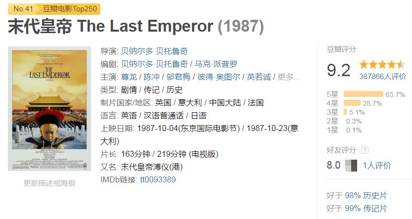 《末代皇帝》在豆瓣Top250中排名第41位,由意大利、英国、中国三个国家联合拍摄,这部片子横扫了第60届奥斯卡金像奖最佳影片、最佳导演、最佳改编剧本等等九个大奖。