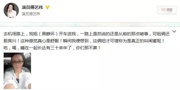 值得注意的是,当天同时抓获的还有黑静环、付艺敏2人,有知情人向腾讯娱乐表示这两人就是她最亲近的闺蜜和妹妹,其中前者也是演艺人士。从傅艺伟微博上也可以看到,她自己称和黑静环好了三十多年,堪比真姐妹。