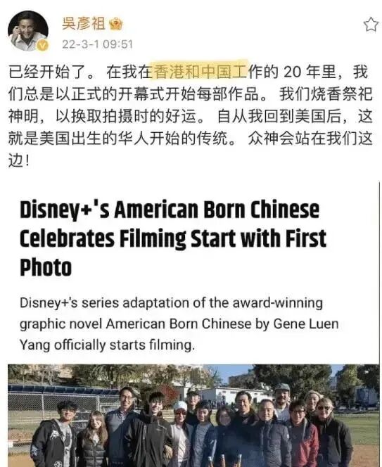 3月1日,著名演员吴彦祖发布了一份文件,庆祝新剧《美生中国人》的开拍,并发布了一张剧组合影。起初,他想和粉丝们分享好消息。出乎意料的是,由于措辞不当,他的立场受到了质疑。