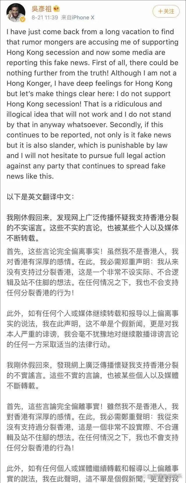 即使吴彦祖取消了他的赞扬,他仍然受到了前所未有的质疑和嘲笑。在强烈的舆论浪潮中,吴彦祖发布了一份文件来表达自己的立场,谴责谣言制造商,并警告散布诽谤言论的网民,说他将采取法律行动来平息风暴。这一次,吴彦祖不知道如何回应他的立场?