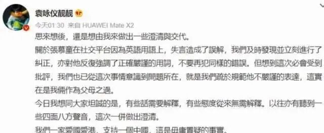 事实上,近年来,许多明星都因为言语问题而引起了争议,包括袁他不久前主动为儿子道歉,但也强调了英语词汇的差异,很容易引起误解。