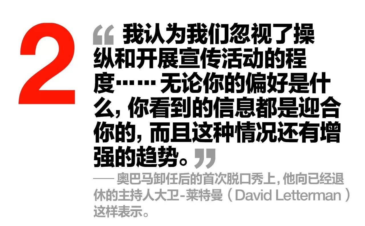 “我认为我们忽视了操纵和开展宣传活动的程度……无论你的偏好是什么,你看到的信息都是迎合你的,而且这种情况还有增强的趋势。”