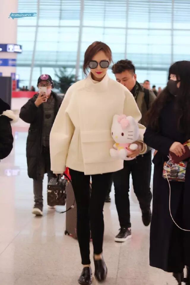 行走在机场的糖糖身着宽松白色短毛呢