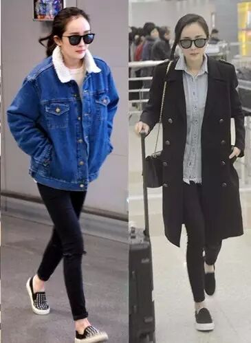 国民女神高圆圆用黑色小脚裤搭配一字领打底衫
