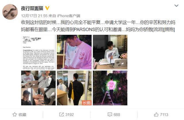12月17日,林依轮的妻子在微博晒出一组儿子林子濠的近照并配文:“申请大学这一年,你的辛苦和努力妈妈都看在眼里,今天能得到PARSONS的认可和邀请,妈妈为你骄傲”,字里行间无不透露出一个普通家长望子成龙终成真的激动。