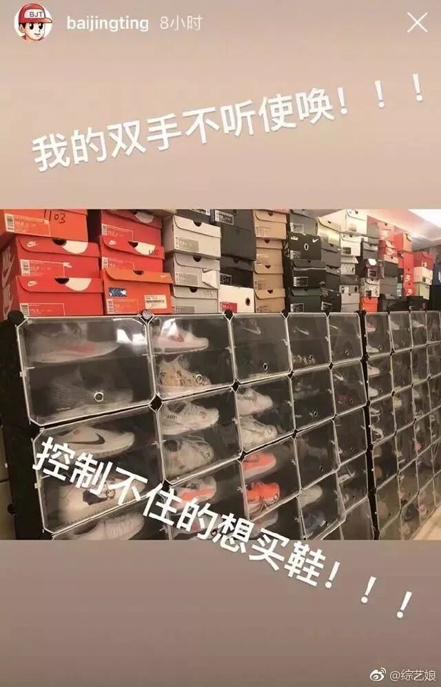 白敬亭除了自己爱鞋子之外,私底下也自称是以鞋交友。不仅微博INS上经常晒新鞋子,家里的正面墙都堆放着鞋子。自称双手不听使唤,控住不住的想买鞋!