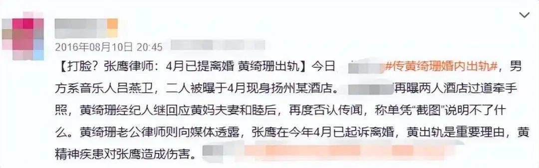 而导致两人婚姻破裂的原因是黄绮珊出轨,她和音乐制作人吕燕卫在酒店开房幽会的照片被曝光。