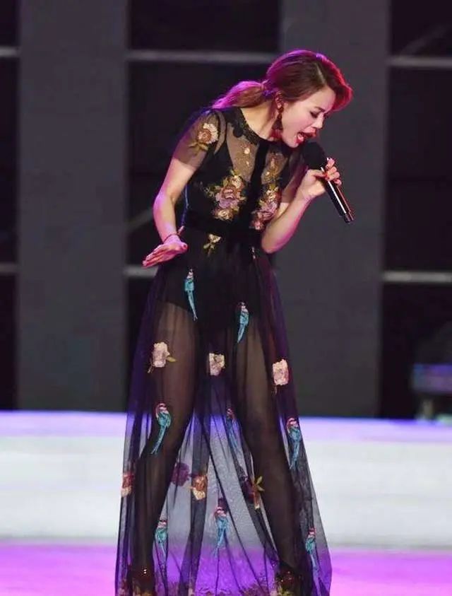 舞台上的容祖儿自信又迷人,穿衣也是很有自己的想法,这套黑色网纱透视裙轻薄如蝉翼,内搭的纯黑色吊带更是清晰可见,裙子上添加了很多花朵图案的元素,比较清新甜美,减少了整体黑色的沉闷,衬的容祖儿更有仙气了。舞台上的她带有光芒和热情,富有感染力,热情澎湃很难不让人喜欢。