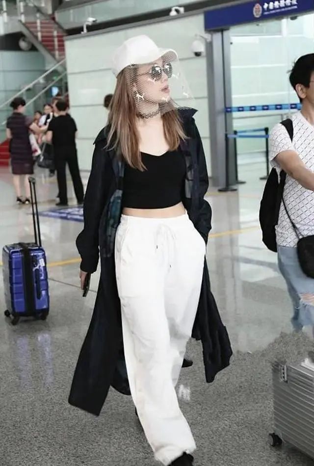 这一套同样是黑白配色,但是风格完全相反,非常有活力的运动风穿搭,很炫酷,内搭的是小短款黑色上衣,V领更显脸小,下身穿着白色高腰运动裤,虽然配色简单,但却让人感受到一种嘻哈歌手的styel。上短下长的造型在视觉上会拉长了腿部的比例,完美展现好身材,外搭黑色风衣,让祖儿的气场更足。