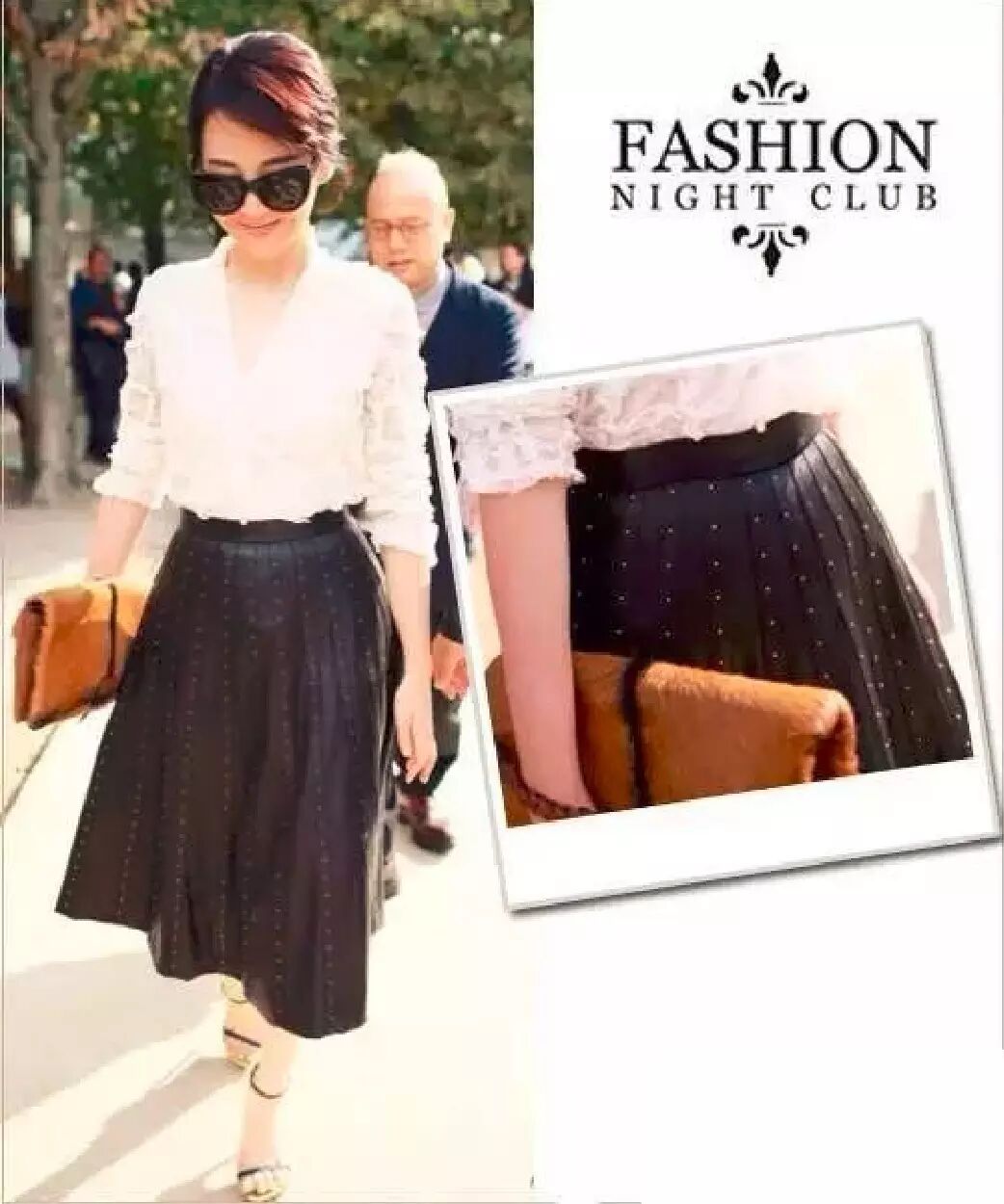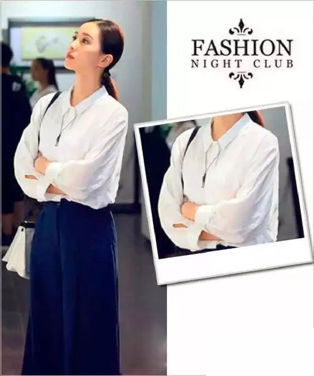 【搭配示范】:白色衬衫+深蓝色半身长裙 【小编点评】:白色衬衫搭配深蓝色半身长裙,清新又文艺,十分适合像刘诗诗这样清纯型的女生。
