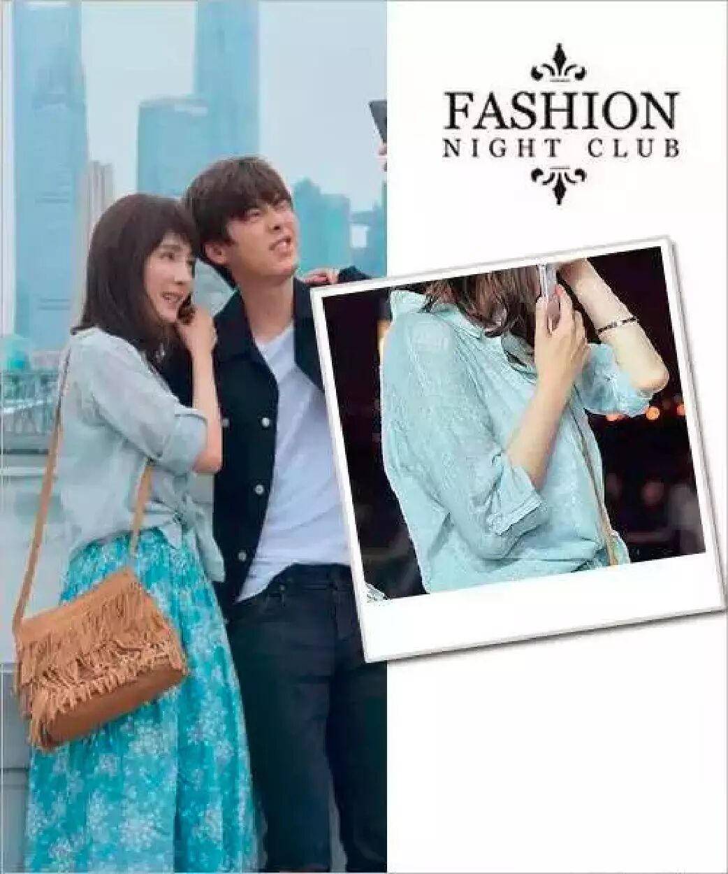 【小编点评】:杨幂在电影《怦然星动》中一件蓝色衬衫搭配蓝色印花长裙,清新又文艺,只是那个棕色的流苏包包看上去实在太违和,所以小编建议菇凉去掉那个包包,再换个发型会更好哦!