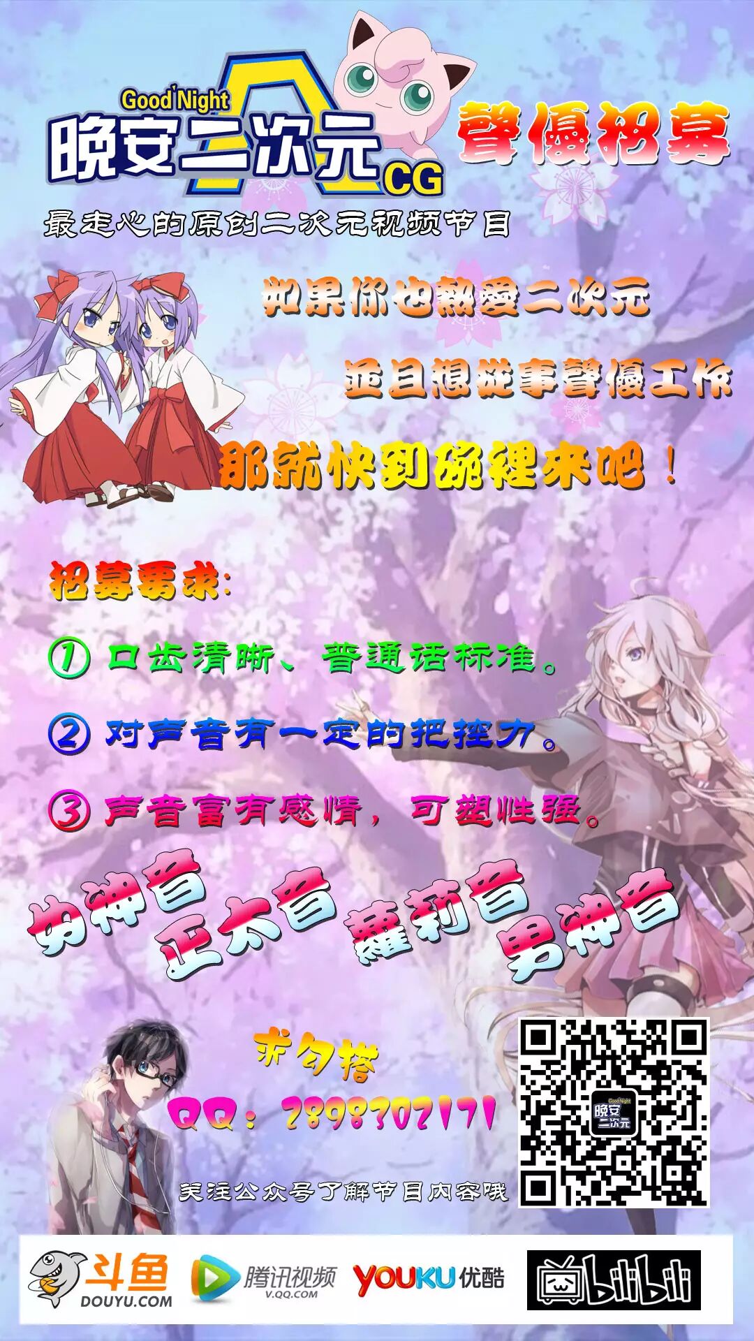 小编再次奉上我们的声优招募令,请喜欢二次元文化,愿意参与二次元声优工作的小伙伴们赶紧与我们联系哦!