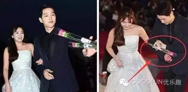 当时,乔妹的手挽在宋仲基的胳膊处,好几次都要挣脱掉了,好在都被仲基老公拉了回来并放回原处,而对于观众们的献花,宋仲基更是一把拿过来递给乔妹,好一个霸道总裁范啊!