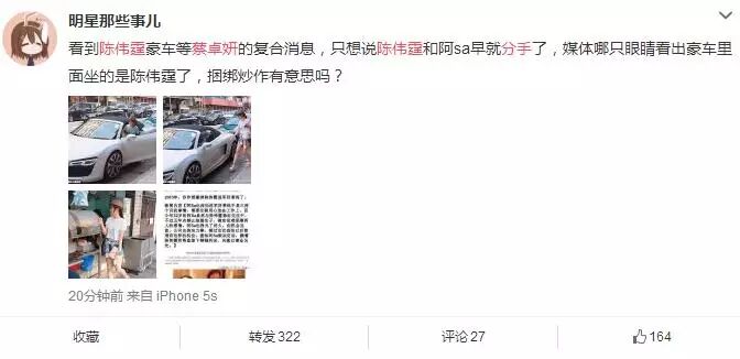 陈伟霆全程都在骚包跑车上吹冷风没有下来,也因此有网友说当时在车上的根本就不是陈伟霆,完全是蔡卓妍在摆拍。