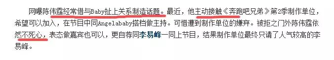 今年五月,网友爆料陈伟霆自荐上跑男,与天使宝贝同台,想借机炒作自己,提高知名度。
