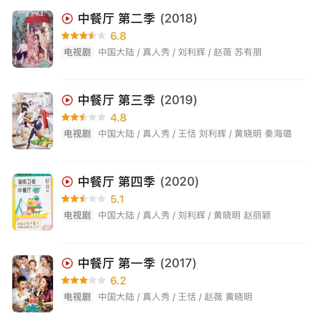 《中餐厅》作为湖南卫视的老牌综艺,从第一季到第四季,评分越来越差,收视率也越来越低。