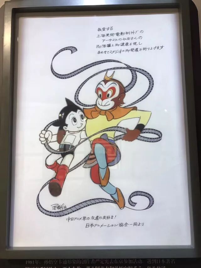 上世纪七八十年代,手冢治虫曾几次来到中国进行学习借鉴,以提升日本漫画的表现力,在此期间他将自己创作的动画人物铁壁阿童木与中国的孙悟空画在了一起。不过,动漫馆里展出的是一件复制品。